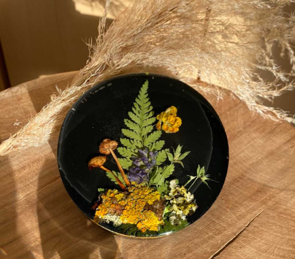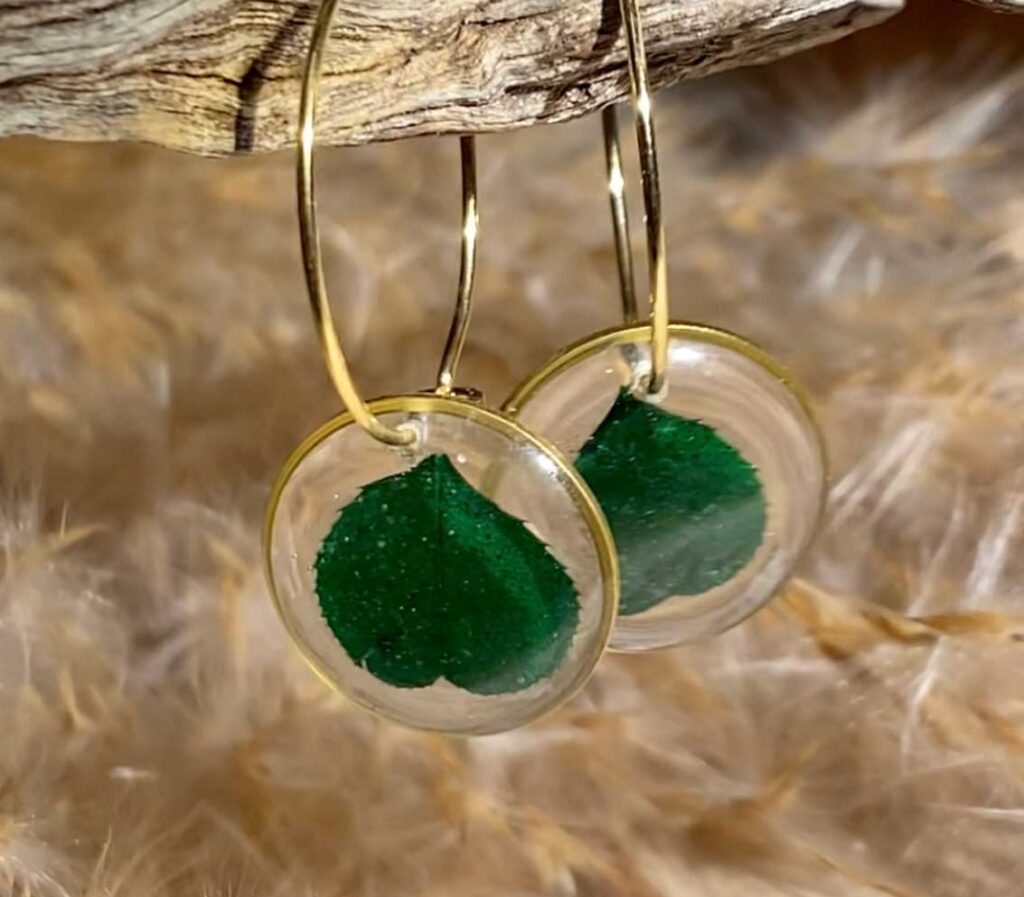 Each piece of jewelry is unique because a natural product is preserved in the resin and each flower is unique. The flowers, plants and mushrooms are collected, pressed and dried themselves and prepared for preservation in the resin. Especially in demand are the earrings in which the filigree flowers of the wild carrot or forget-me-not flowers are embedded. These are the small fine white flowers in a circular arrangement.